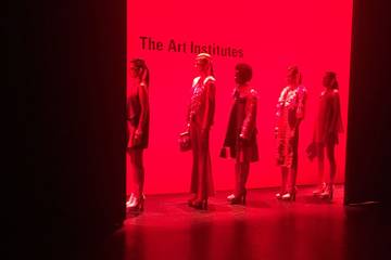 The nine students that showed their collections tonight from Art Institutes across the country seemed to have united into two camps. One side put a sharp focus on casualwear while the other provided attendees of a most exclusive soirée with the perfect formal gowns. In Skylight Moynihan the sassy tomboys of the skatepark dropped and rolled in patched denim and fun fur right next to the languid swans who preferred to sparkle gently under a chandelier.