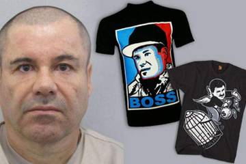 The fashion line features a wanted poster with the multimillion dollar bounty, an image of Guzman escaping prison with a bag of cash, and his face with the words "Boss" in the same red and blue design as US President Barack Obama's famous campaign poster.