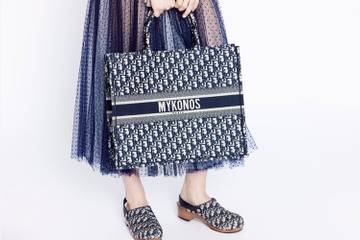 The collection will include striped bodysuits, cashmere sweaters, silk scarves and cotton pareos featuring the words “J’Adior Mykonos” (I love Mykonos). The shop will also sell bracelets, sandals and ballerina pumps with the words “Christian Dior Mykonos”. But perhaps the most striking piece in the collection is the tote bag with the name of the island woven into the canvas.