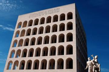 The building, known by Italians as the Square Colosseum but officially entitled the Palace of Italian Civilsation, was built by Mussolini as the centrepiece of the EUR district he created in the south of Rome for a 1942 Universal Exhibition that never took place because of World War II.