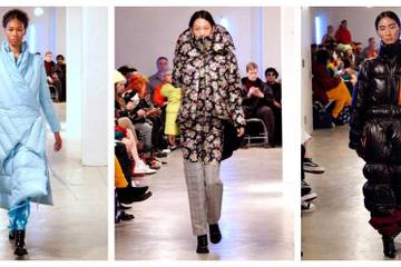 Puffer coats and ski jackets were reconstructed to be oversized, with a notable light blue one done with a wrap effect. A floral puffer coat was done with a neckline that covered the model's mouth as she walked the runway.