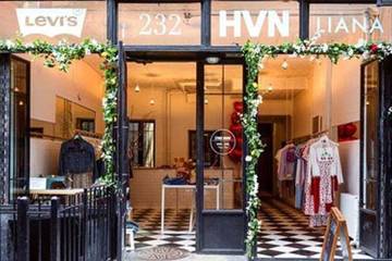 Among Levi’s pieces on display are the Made & Crafted splice flare, the classic 501 shorts and the Trucker jacket. Select items will feature the custom HVN cherry print design.