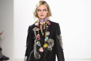 Libertine's designer Johnson Hartig used his fall/winter 2018 runway show to show us how many ways black can be reinterpreted from sequins to patches and the whole nine yards. His opening look was a heavily sequin embellished black coat with a sheer dress underneath and heavily embroidered sleeves. This wasn't your average black coat outfit pairing for winter, but, rather, a way to make a statement and elevate the mundane.