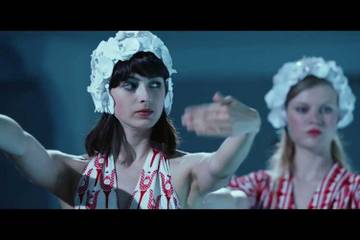 The short drama features two women dressed in embellished sweaters and sixties inspired printed skirts. One wants to become a synchronized swimmer, the other fears swimming due to past trauma with a shark.