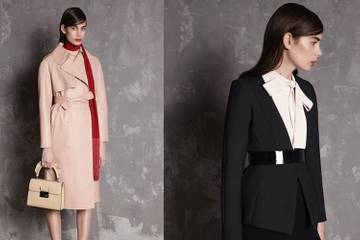 Currently available for pre-order for 15 days, items from the collection 53 piece collection include trench coats, shifts dresses and pussy bow blouses in an array of pastel pinks, blacks, ruby reds and white. Many of the designs show clear links to the fashion house signature staples, such as the bows, as well as a hint of graphic touches and sixties/mod influences.