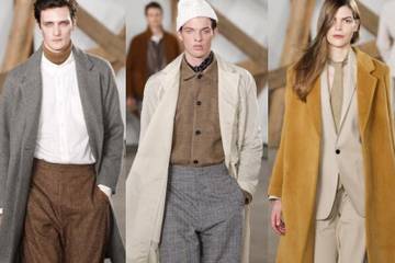 The novel The Grey Gentlemen (a story of men in grey suits who come to a small town to suck the colour out of locals) inspired the moody dark-to-light palette of Robert Geller's collection. Loose, urban silhouettes were bathed in deepest black to neutral ecru shades, followed by hues of aubergine, plum and mustard. Subtle textures elevated looks; tailoring was rendered in mohair while outerwear boasted a satin-infused sheen.N Hoolywood