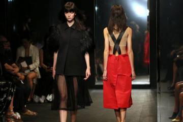 There were micro black shorts and bras under a large coat or a black, sleeveless men's jacket, a transparent skirt with a crop top, or a short black pleated skirt with a sheer black shirt worn over a white bra.