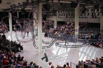 London may have celebrated 40 years of Punk earlier this month, but its influence has spread far and beyond, including in Kris van Assche's collection for Dior this weekend. With a set reminiscent of a fairground, it reminded Assche of his Antwerp days where the new wave kids would come to hang out. Although van Assche's work is much too clean to be labeled as punk, there were plenty of references in his hybrid sportswear, with models sporting black nail varnish, neck jewellery, eyelet closures on trousers and jacket sleeves and a luxury version of a Dr Martens boot. Dior may be well known for its impeccably cut tailoring, but there were no classic suits shown on the runway. Perhaps these were omitted for the sake of the show and laying a foundation for the collection image, but you would hope these will remain available for a customer who is not likely to invest in a suit cum harness hybrid.