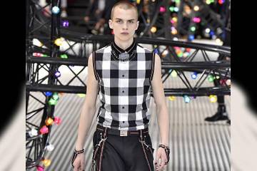Dark, moody and menacing, there was even something slightly S&M in the way that Dior's Belgium-born designer Kris Van Assche managed to turn the braces into chest armour-cum-jewellery. There were still more echoes of punk in the check shirts and evocations of the ghost of Johnny Rotten's tartan in the clever red stitching against the collection's predominantly black core.
