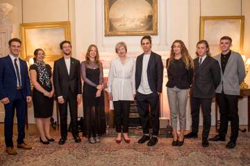 Photo 2: Prime Minister Theresa May, Natalie Massenet with BFC/Vogue Designer Fashion Fund Winners and Fund Supporter, Christopher Bailey; from L-R: Peter Pilotto, Christopher De Vos, Mary Katrantzou, Prime Minister Theresa May, Natalie Massenet, Christopher Bailey, Sophia Webster, Nicholas Kirkwood