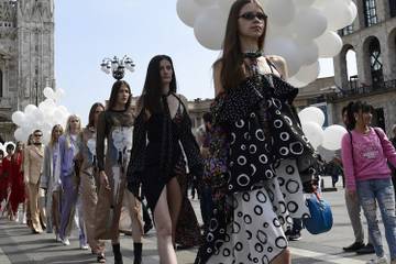 Ssheena also sent a pseudo-flight suit down the catwalk that was livened up with splashes of black and blue paint. Circle motifs were a recurring theme. Mandelli said they were a nod to the shape of the namesake of a 1930s lesbian night club in Paris called Le Monocle. "The meaning now for me is that my girls go express themselves Piazza Duomo (Duomo Square)," she said with a laugh.
