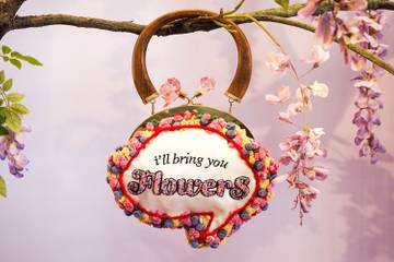 The quirky was still seen with slogans such as ‘Roses are Red’, ‘I’ll Bring You Flowers’ and ‘Chickflix and Frills’, and her showstopper knee-high caged boots have been encased in gems and vintage brooch inspired crystals.
