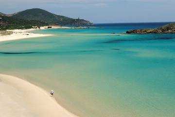 Images: Wikimedia Commons, Su Giudeu, Chia, Sardinia, Italy, 25 May 2011, Emmaquadro61; Roman Holiday movie poster 1953 https://www.imdb.com/title/tt0046250/mediaviewer/rm3628859648; Cropped screenshot of Audrey Hepburn from the trailer for the film Roman Holiday.