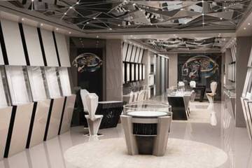 The geometric pattern featured on the façade and on the ceiling of the boutique first appeared on the dial of the Astronomia Meteorite watch in 2016. The center showcase, visible upon entry, mirrors the unique shape of the sapphire dome casing featured throughout the record-breaking Astronomia collection as well, and took over two months to perfect.
