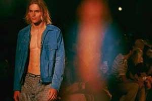 Urban cowboys were the order of the day at Prada, one of the strongest men's shows the company has presented in some time. Everything in the collection was top stitched, with embroidered stitching on lapels, shirting, trousers, even, brown leather-detailed on denim. For evening, there was Swarovski stitching on suiting and knife pleat trousers.